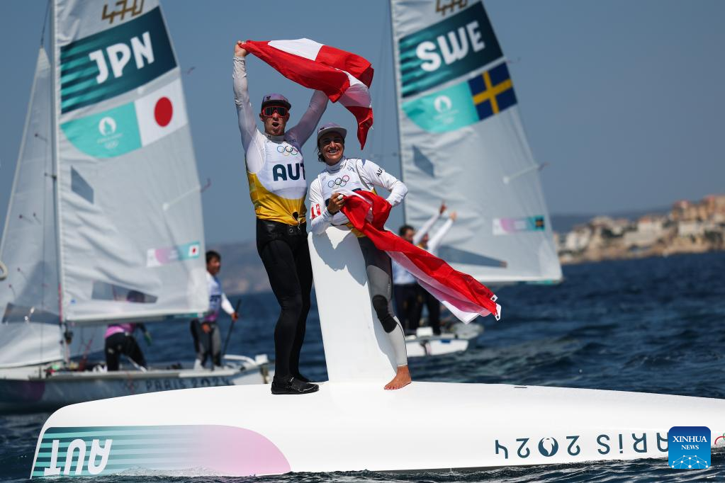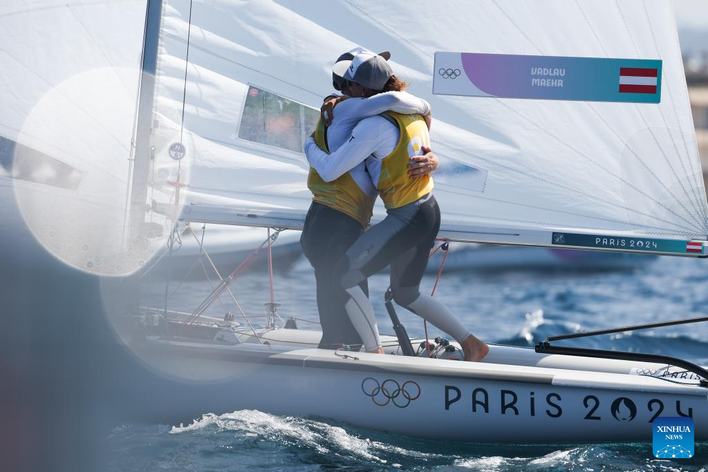 Lara Vadlau/Lukas Maehr of team Austria celebrate after the mixed dinghy medal race of sailing at the Paris 2024 Olympic Games at the Marseille Marina in Marseille, France, Aug. 8, 2024. (Xinhua/Zheng Huansong)