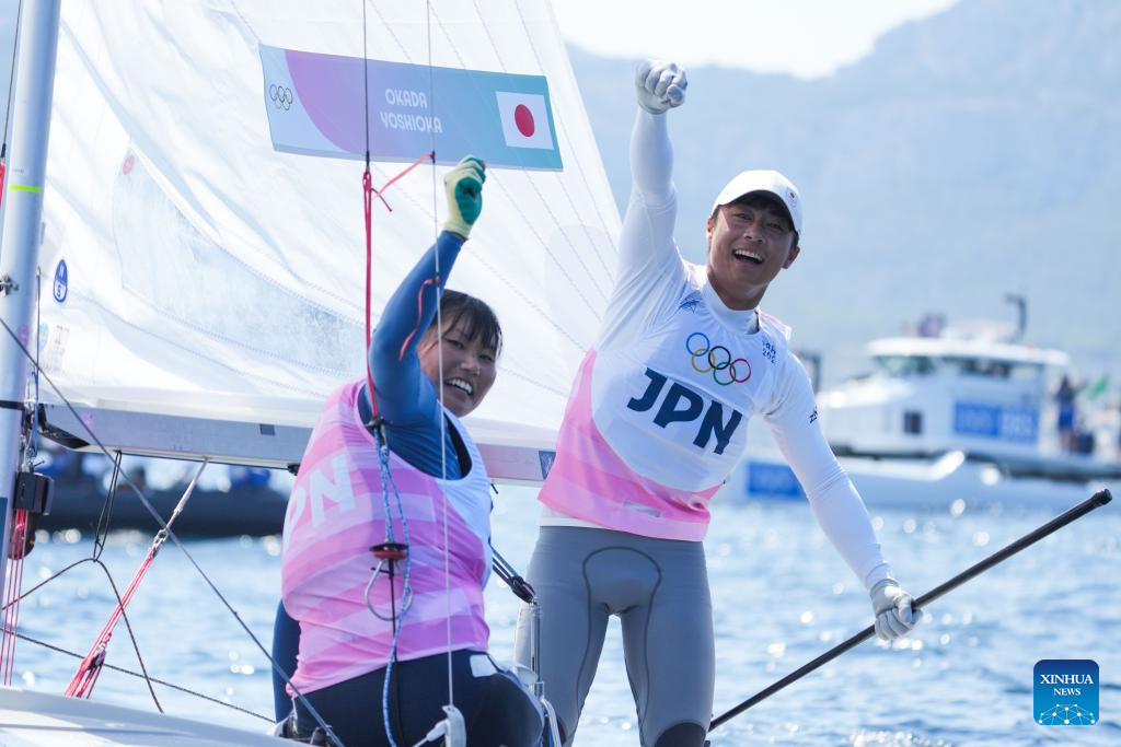 Okada Keiju (R)/Yoshioka Miho of team Japan celebrate after the mixed dinghy medal race of sailing at the Paris 2024 Olympic Games at the Marseille Marina in Marseille, France, Aug. 8, 2024. (Xinhua/Zheng Huansong)
