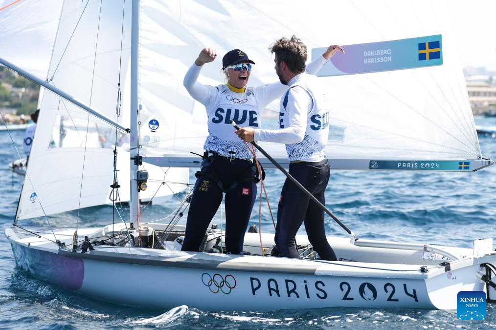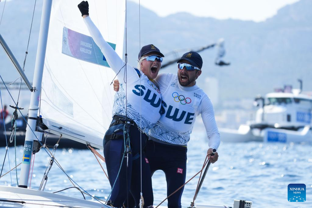 Anton Dahlberg (R)/Lovisa Karlsson of team Sweden celebrate after the mixed dinghy medal race of sailing at the Paris 2024 Olympic Games at the Marseille Marina in Marseille, France, Aug. 8, 2024. (Xinhua/Zheng Huansong)