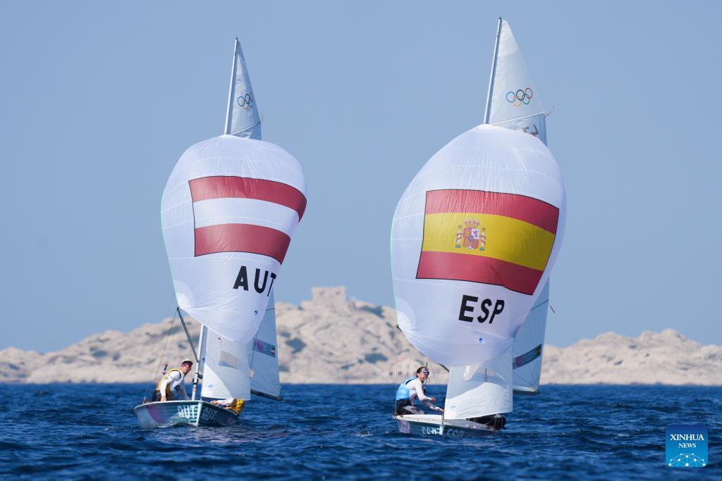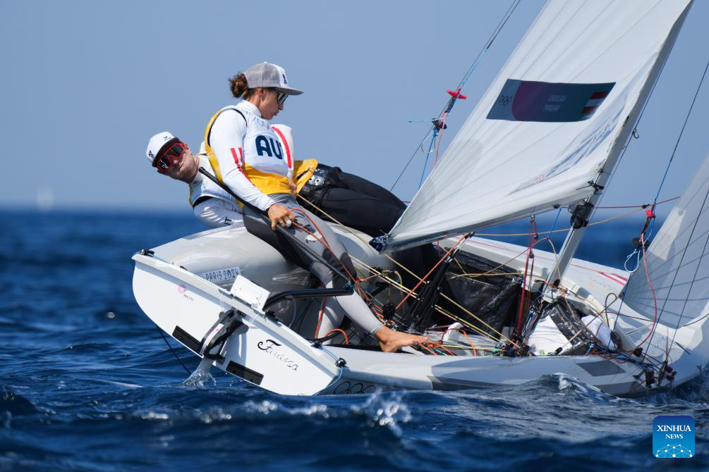 Lara Vadlau/Lukas Maehr of team Austria (L) compete during the mixed dinghy medal race of sailing at the Paris 2024 Olympic Games at the Marseille Marina in Marseille, France, Aug. 8, 2024. (Xinhua/Zheng Huansong)
