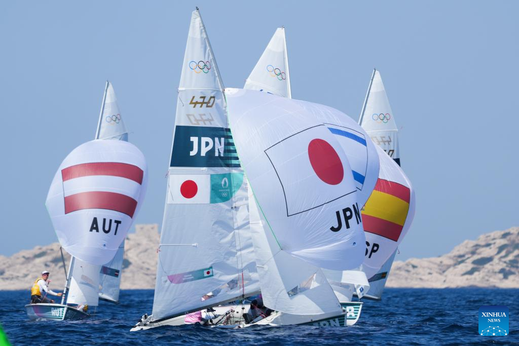 Athletes compete during the mixed dinghy medal race of sailing at the Paris 2024 Olympic Games at the Marseille Marina in Marseille, France, Aug. 8, 2024. (Xinhua/Zheng Huansong)