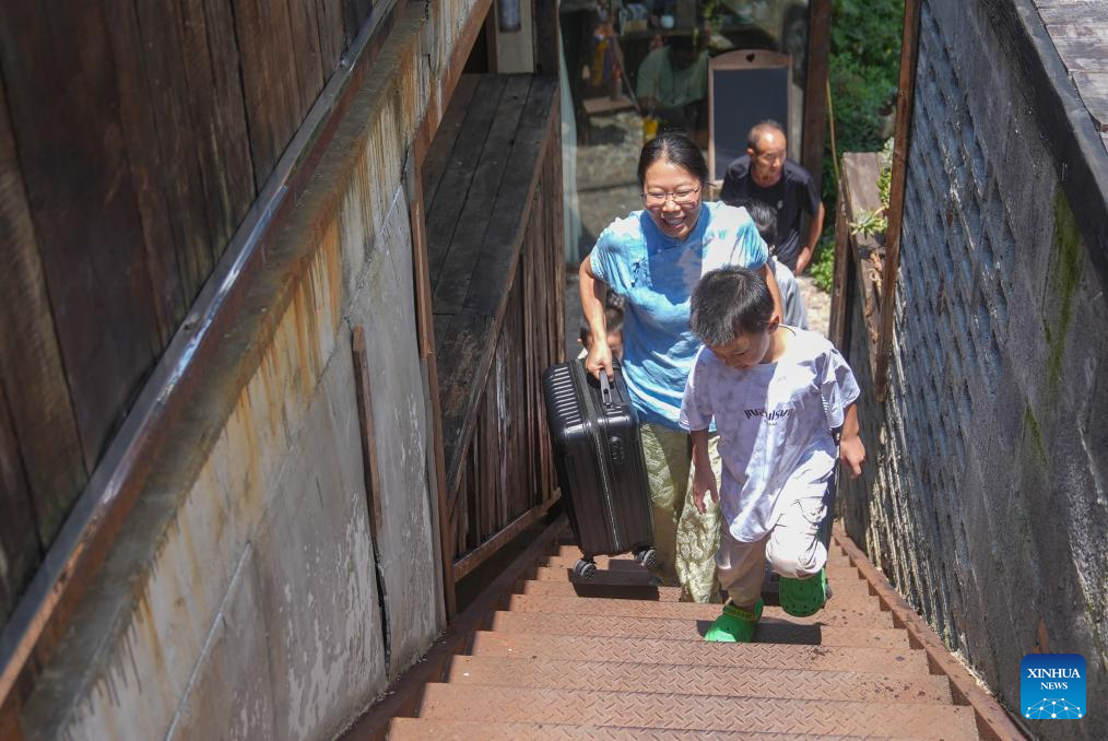 Wei Qun, a homestay owner, helps the guests carry belongings at her hostel in Honghuaping Village of Shennongjia Forest District, central China's Hubei Province, Aug. 6, 2024. (Xinhua/Du Zixuan)