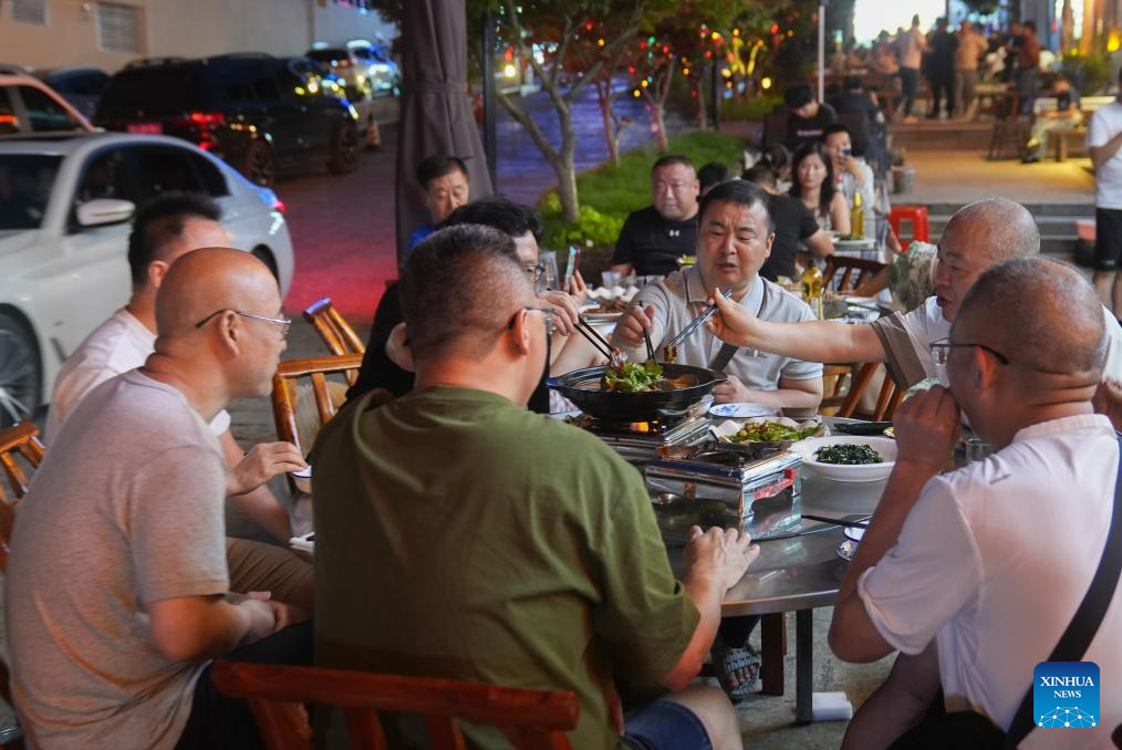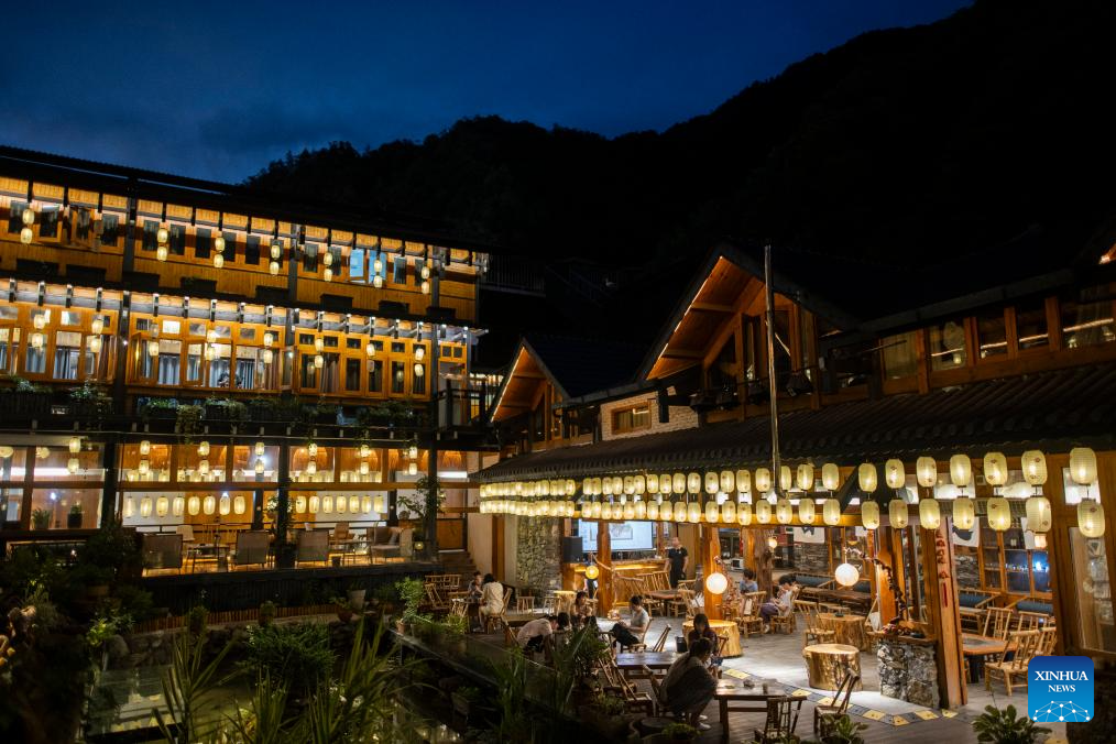 Tourists have a meal in Muyu Town of Shennongjia Forest District, central China's Hubei Province, Aug. 5, 2024. (Xinhua/Du Zixuan)