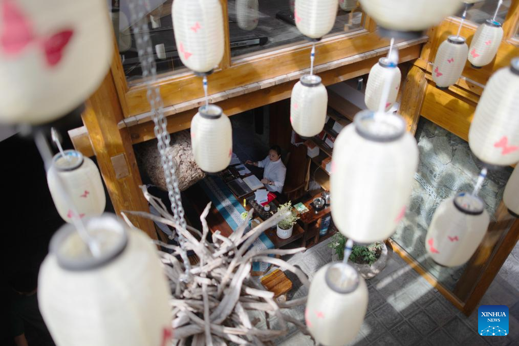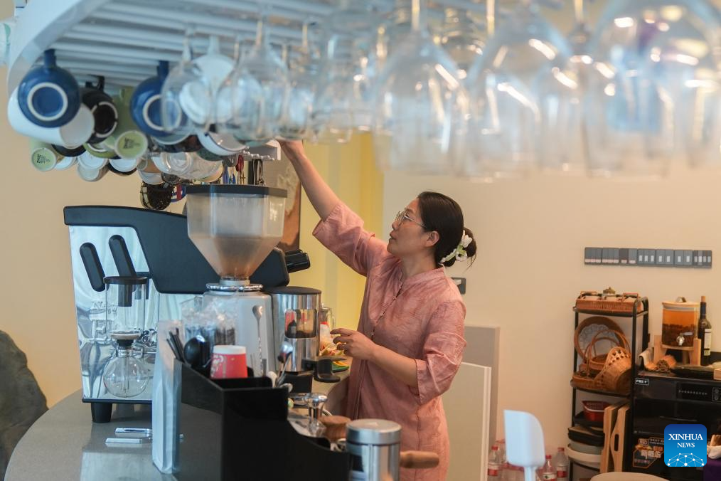 A staff member works at a homestay in Muyu Town of Shennongjia Forest District, central China's Hubei Province, Aug. 5, 2024. (Xinhua/Du Zixuan)