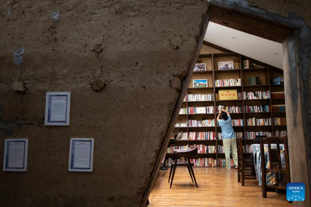 Wei Qun, a homestay owner, sorts books at the reading room of her hostel in Honghuaping Village of Shennongjia Forest District, central China's Hubei Province, Aug. 6, 2024. (Xinhua/Wu Zhizun)