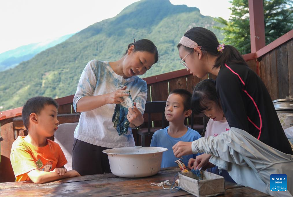 Wei Qun, a homestay owner, helps kids experience tie-dyeing at her hostel in Honghuaping Village of Shennongjia Forest District, central China's Hubei Province, Aug. 7, 2024. (Xinhua/Du Zixuan)