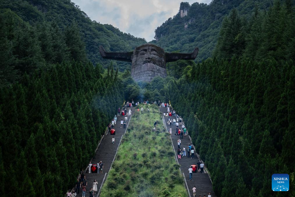 Tourists visit Shennongtan scenic spot in Shennongjia Forest District, central China's Hubei Province, Aug. 5, 2024.Located in the eastern part of the Qinba mountains, Shennongjia Forestry District, with the forest coverage of over 91 percent, has an average elevation of 1,700 meters. The average temperature here is lower than 20 degrees Celsius in summer, making it a popular destination for tourists.