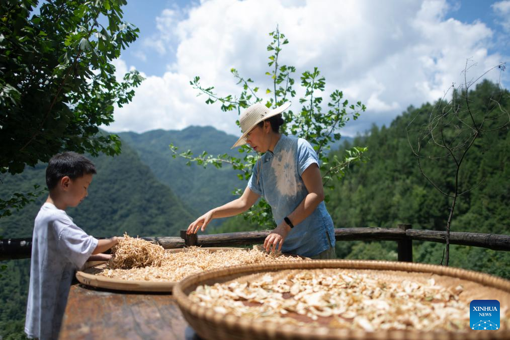 Wei Qun, a homestay owner, shows dried radish to a kid at her hostel in Honghuaping Village of Shennongjia Forest District, central China's Hubei Province, Aug. 6, 2024. (Xinhua/Wu Zhizun)