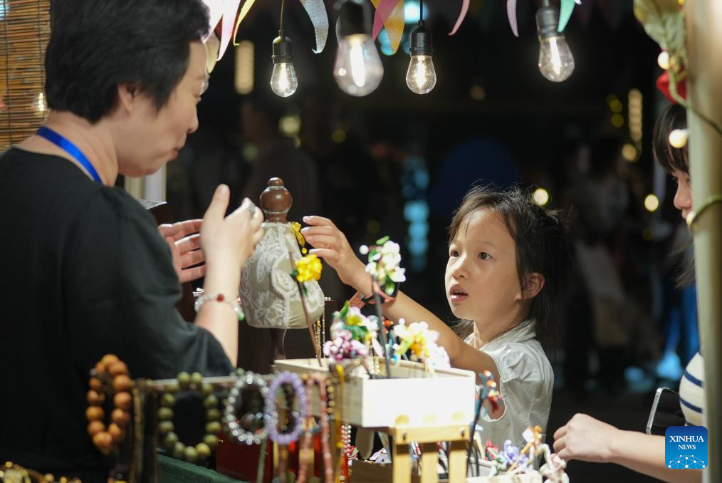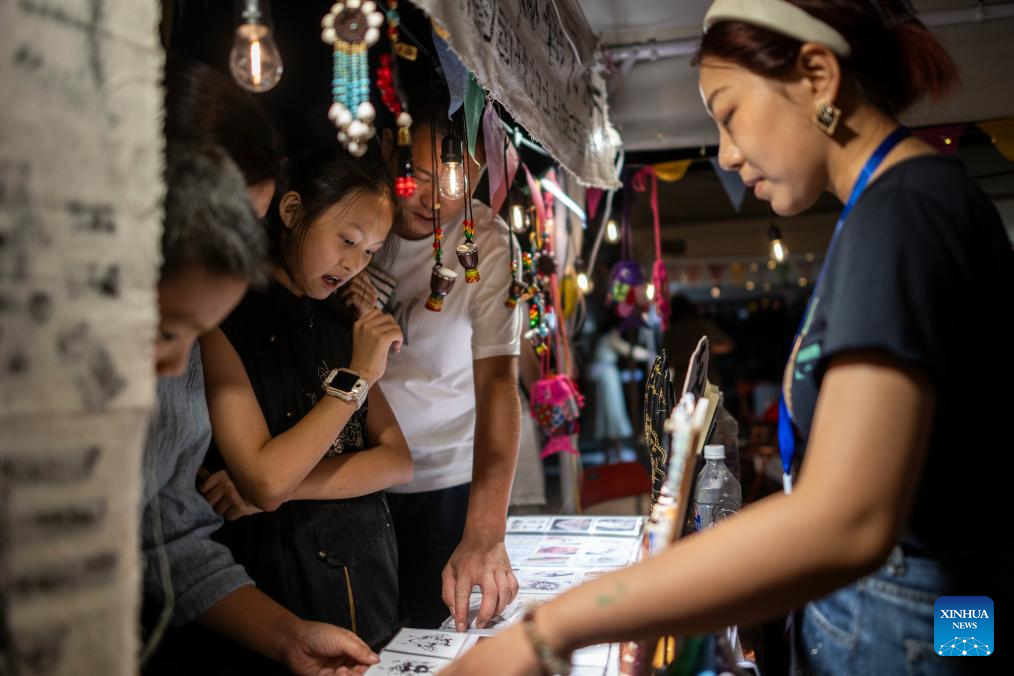Tourists have fun at an open-air fair in Muyu Town of Shennongjia Forest District, central China's Hubei Province, Aug. 5, 2024. (Xinhua/Du Zixuan)