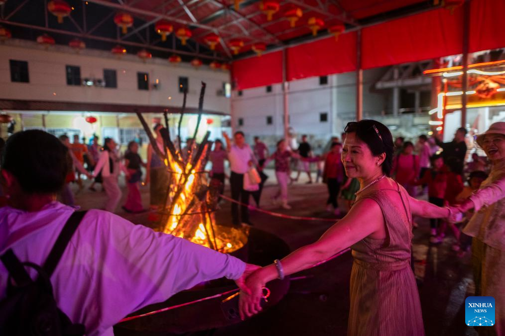 Tourists dance at a bonfire gala in Muyu Town of Shennongjia Forest District, central China's Hubei Province, Aug. 6, 2024. (Xinhua/Wu Zhizun)