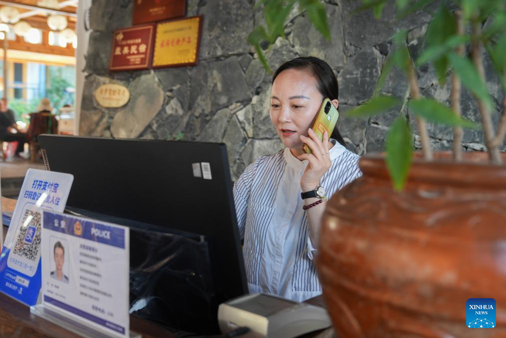 Wan Yulian, a homestay owner, works at her hostel in Muyu Town of Shennongjia Forest District, central China's Hubei Province, Aug. 5, 2024. (Xinhua/Du Zixuan)