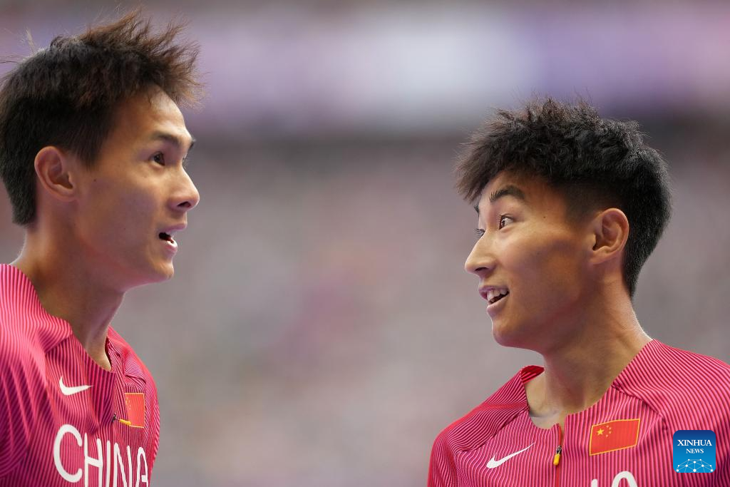 Xie Zhenye (L) and Deng Zhijian of team China compete during the men's 4X100m relay round 1 of Athletics at the Paris 2024 Olympic Games in Paris, France, Aug. 8, 2024. (Xinhua/Li Ming)