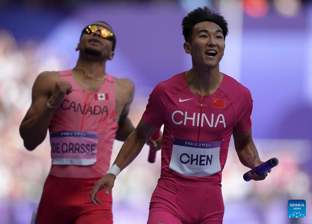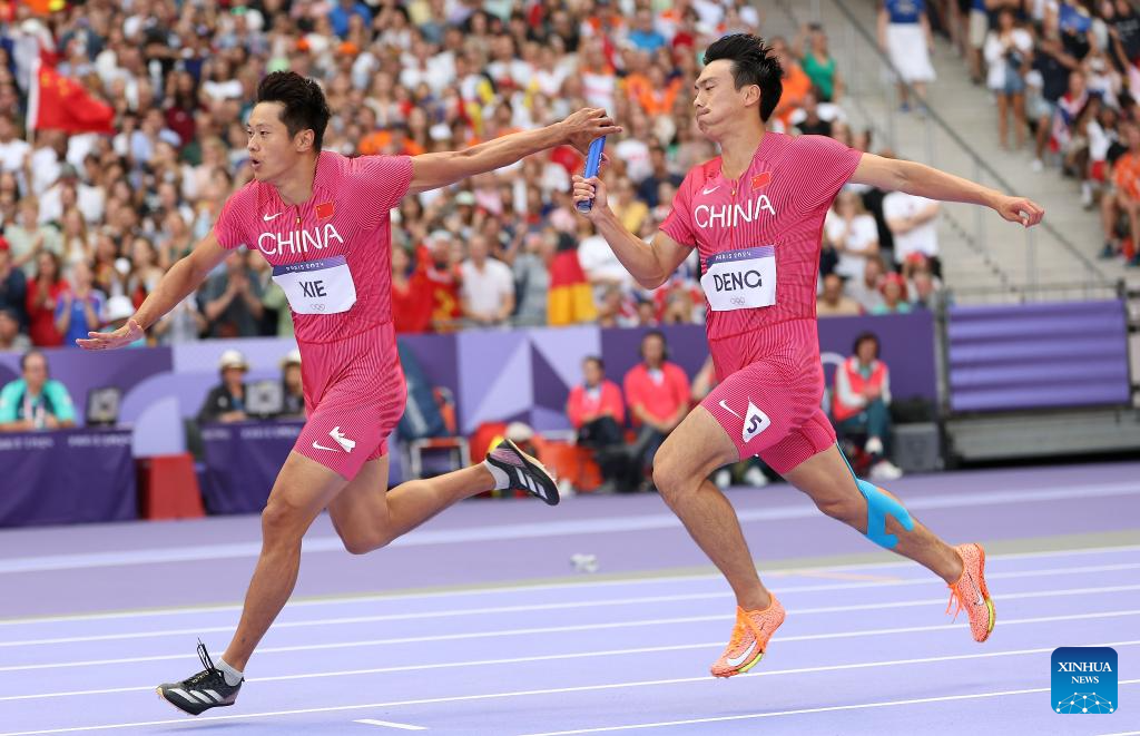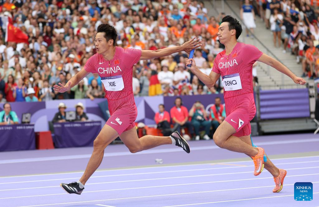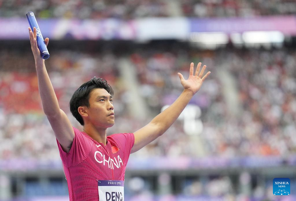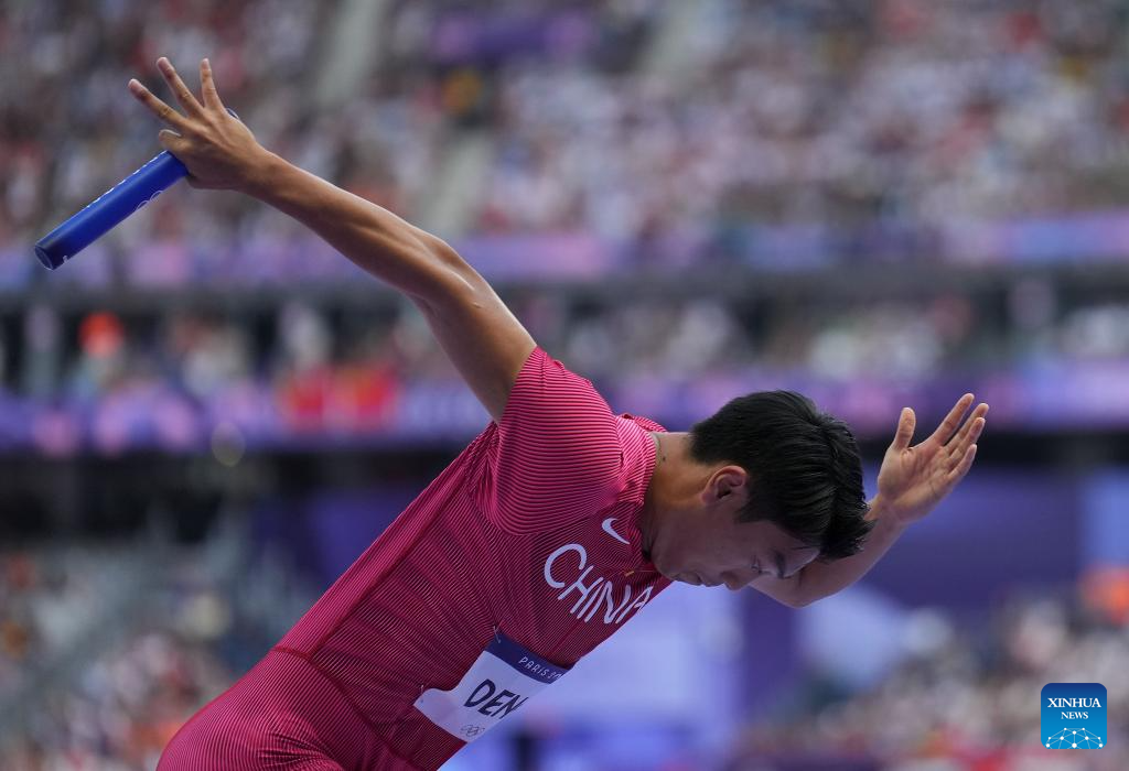 Deng Zhijian of team China competes during the men's 4X100m relay round 1 of Athletics at the Paris 2024 Olympic Games in Paris, France, Aug. 8, 2024. (Xinhua/Lui Siu Wai)