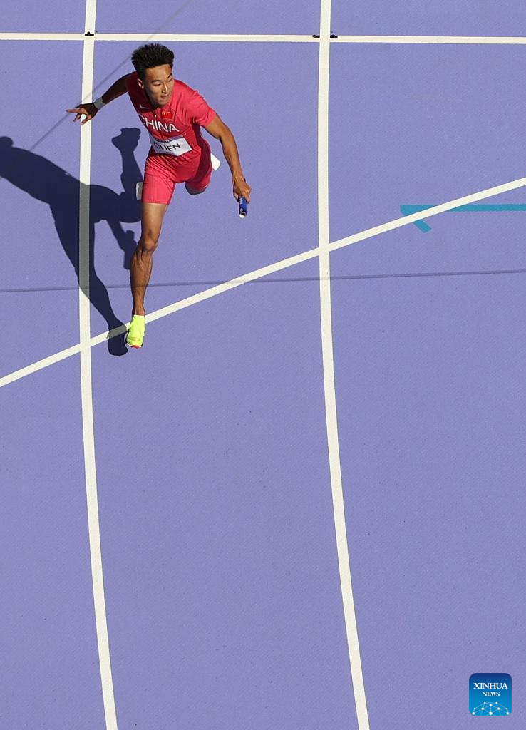 Chen Jiapeng of team China competes during the men's 4X100m relay round 1 of Athletics at the Paris 2024 Olympic Games in Paris, France, Aug. 8, 2024. (Xinhua/Li Ying)