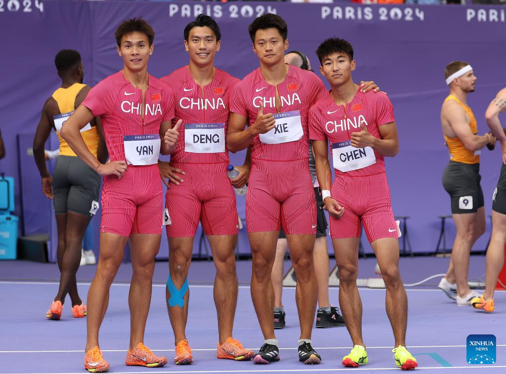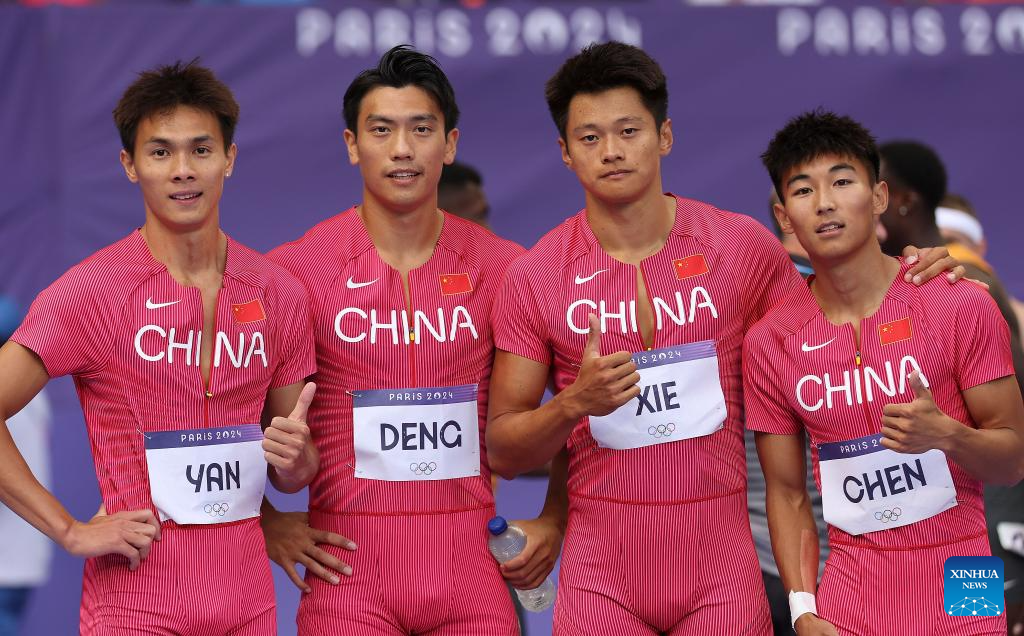 Chen Jiapeng, Xie Zhenya, Deng Zhijian and Yan Haibin (R to L) of team China take a group photo after the men's 4X100m relay round 1 of Athletics at the Paris 2024 Olympic Games in Paris, France, Aug. 8, 2024. (Xinhua/Li Ming)