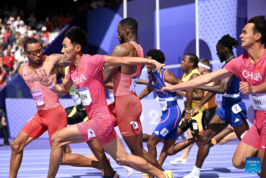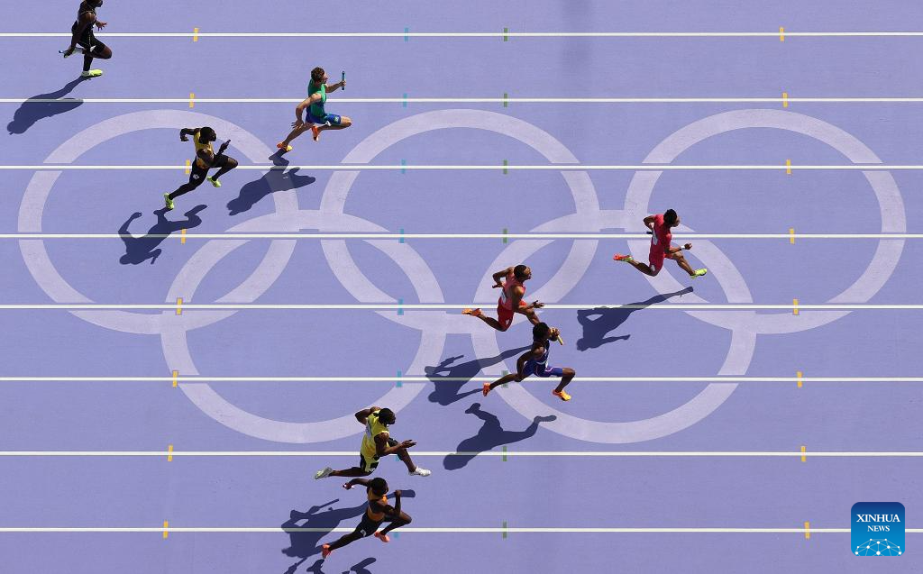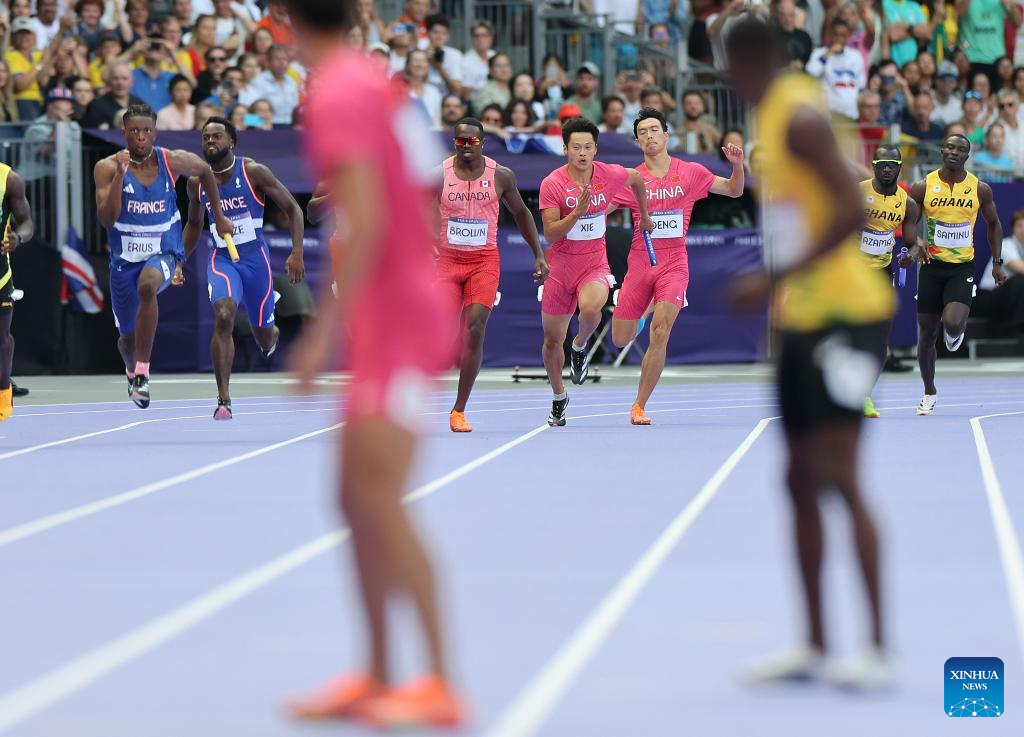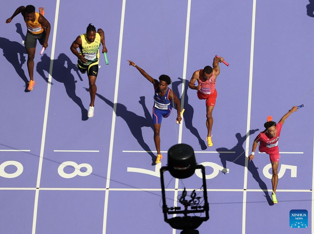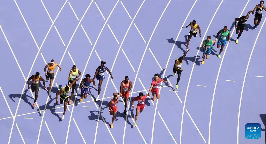 Athletes compete during the men's 4X100m relay round 1 of Athletics at the Paris 2024 Olympic Games in Paris, France, Aug. 8, 2024. (Xinhua/Li Ying)