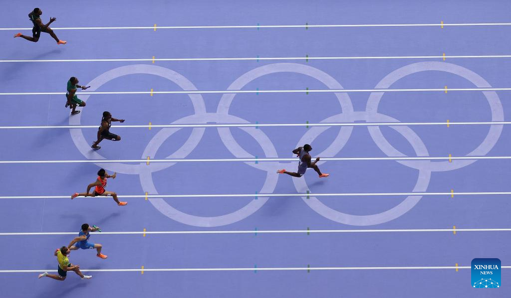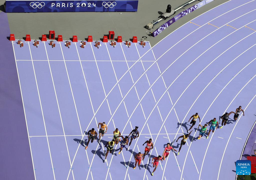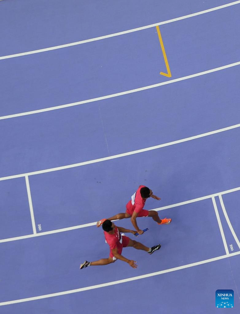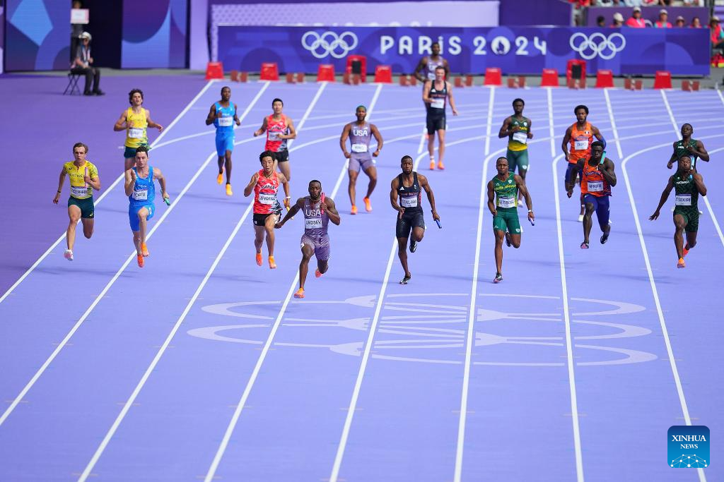 Athletes compete during the men's 4X100m relay round 1 of Athletics at the Paris 2024 Olympic Games in Paris, France, Aug. 8, 2024. (Xinhua/Li Ying)