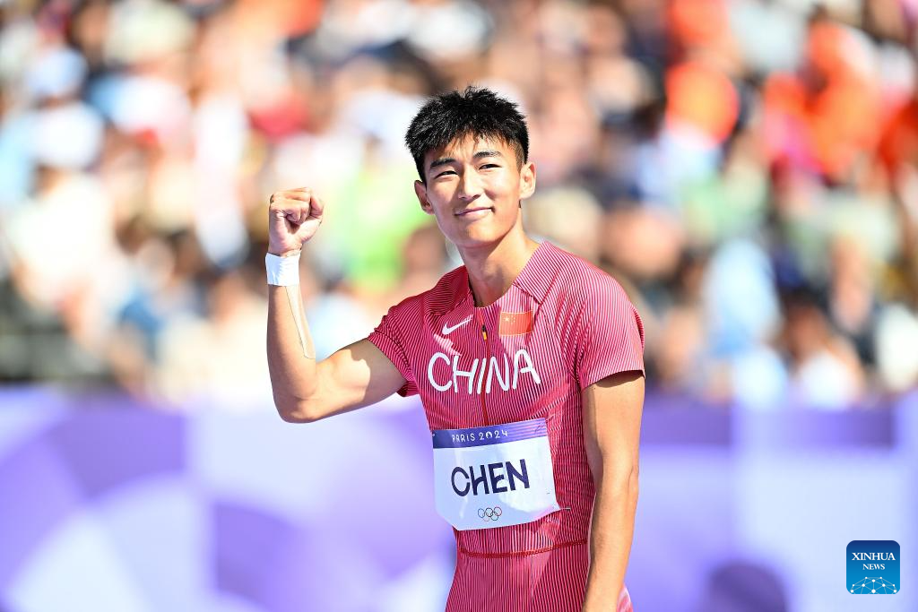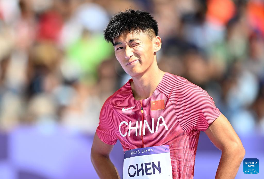 Chen Jiapeng of team China reacts before the men's 4X100m relay round 1 of Athletics at the Paris 2024 Olympic Games in Paris, France, Aug. 8, 2024. (Xinhua/Song Yanhua)