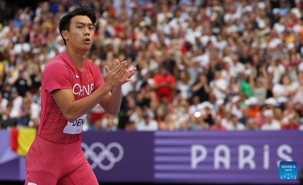 Deng Zhijian of team China reacts after the men's 4X100m relay round 1 of Athletics at the Paris 2024 Olympic Games in Paris, France, Aug. 8, 2024. (Xinhua/Li Ming)