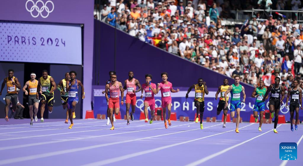 Xie Zhenye (4th L back) and Deng Zhijian (3rd R back) of team China compete during the men's 4X100m relay round 1 of Athletics at the Paris 2024 Olympic Games in Paris, France, Aug. 8, 2024. (Xinhua/Li Gang)