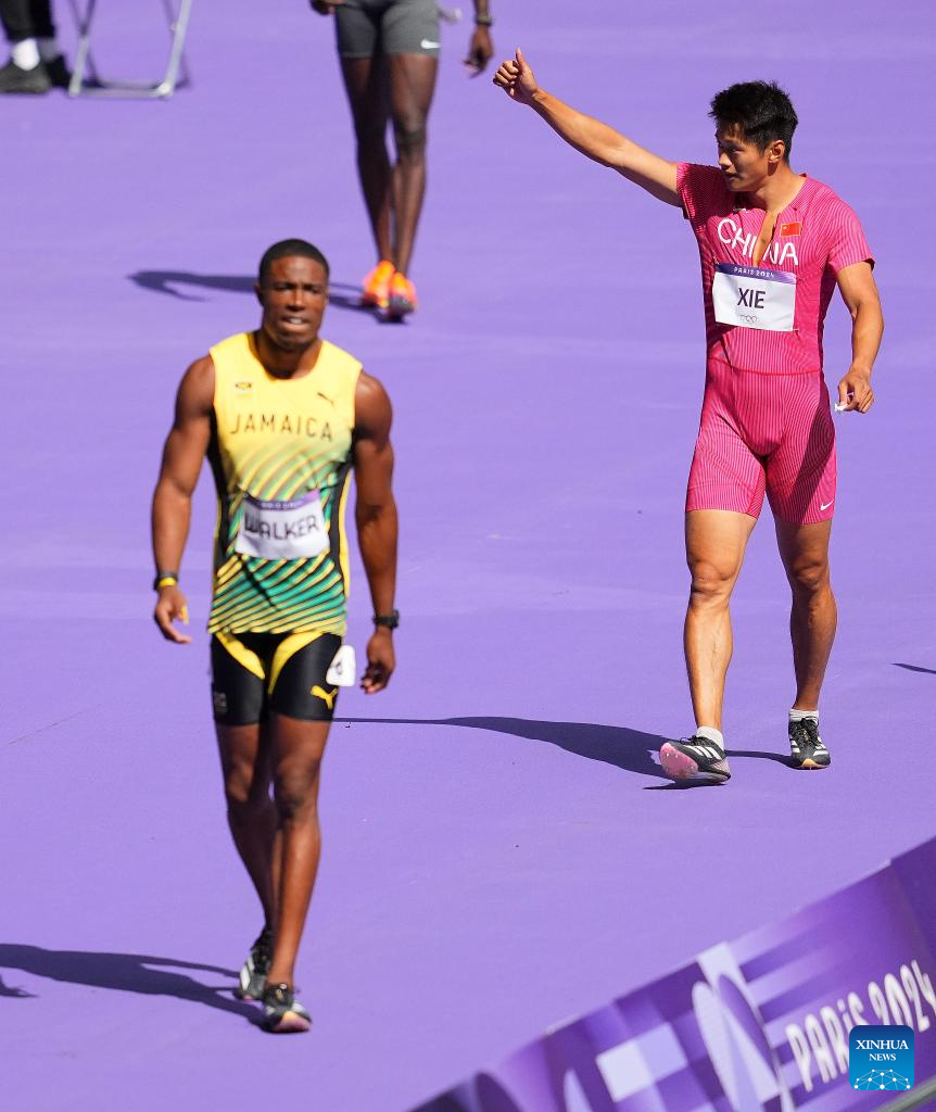 Xie Zhenye (R) of team China reacts after the men's 4X100m relay round 1 of Athletics at the Paris 2024 Olympic Games in Paris, France, Aug. 8, 2024. (Xinhua/Xu Chang)