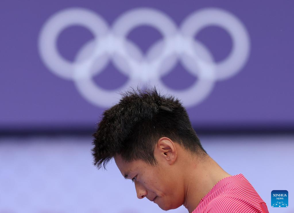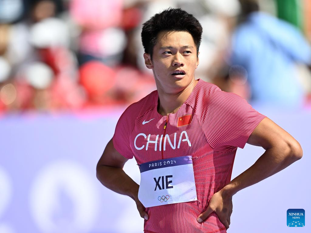 Xie Zhenye of team China reacts after the men's 4X100m relay round 1 of Athletics at the Paris 2024 Olympic Games in Paris, France, Aug. 8, 2024. (Xinhua/Song Yanhua)
