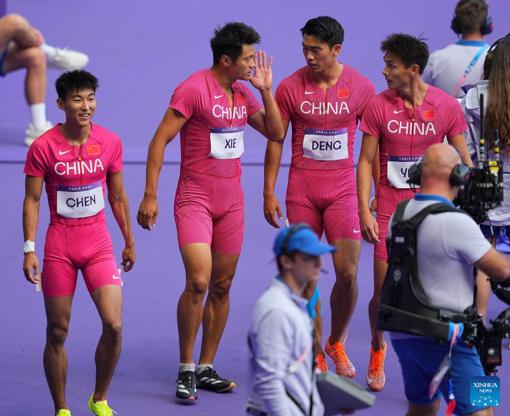 Chen Jiapeng, Xie Zhenya, Deng Zhijian and Yan Haibin (L to R) of team China react after the men's 4X100m relay round 1 of Athletics at the Paris 2024 Olympic Games in Paris, France, Aug. 8, 2024. (Xinhua/Xu Chang)