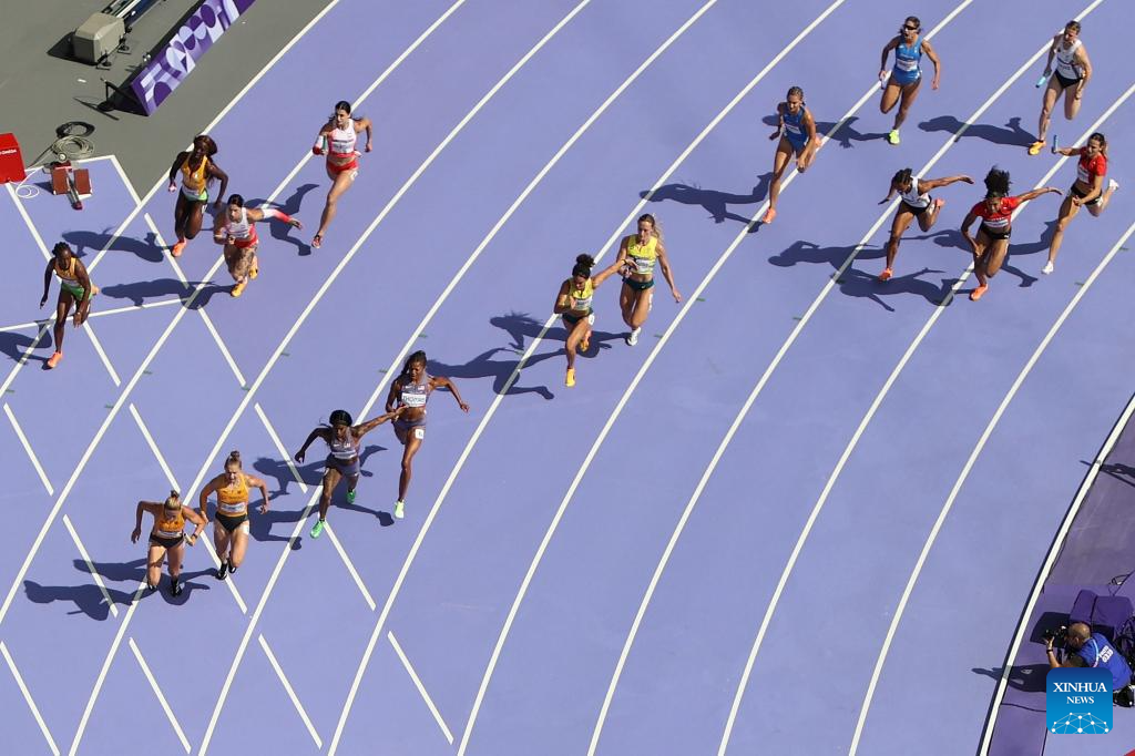 Athletes compete during the women's 4X100m relay round 1 of Athletics at the Paris 2024 Olympic Games in Paris, France, Aug. 8, 2024. (Xinhua/Li Ying)