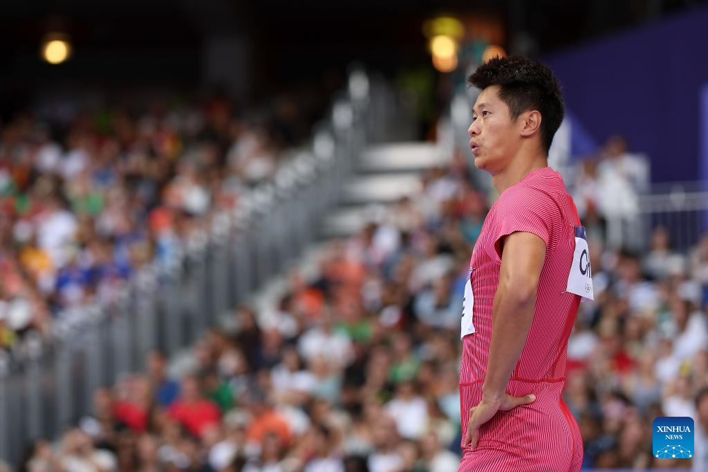 Xie Zhenye of team China reacts before the men's 4X100m relay round 1 of Athletics at the Paris 2024 Olympic Games in Paris, France, Aug. 8, 2024. (Xinhua/Li Ming)