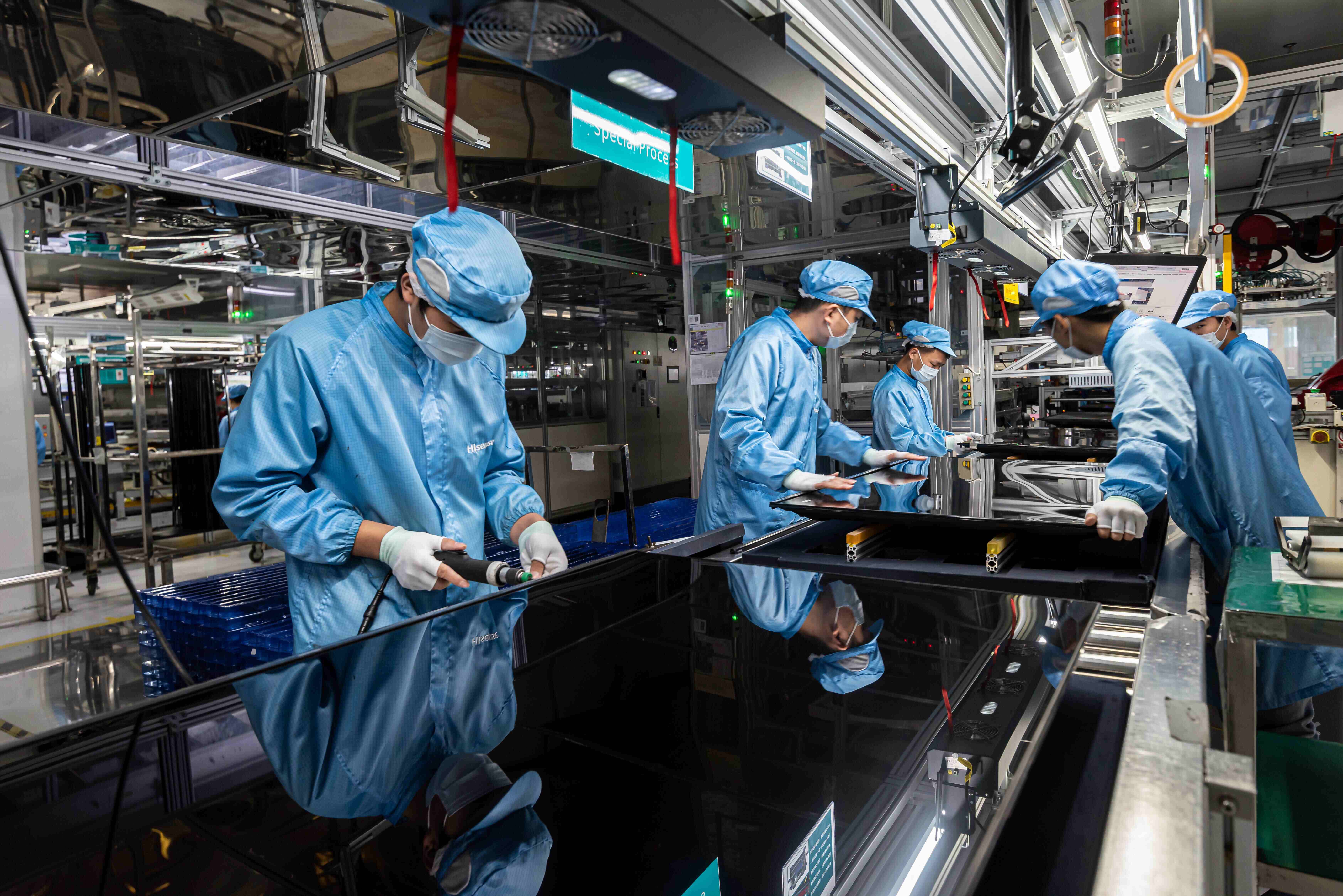 Workers produce televisions at a factory of Chinese electronics manufacturer Hisense. (Photo courtesy of the interviewee)