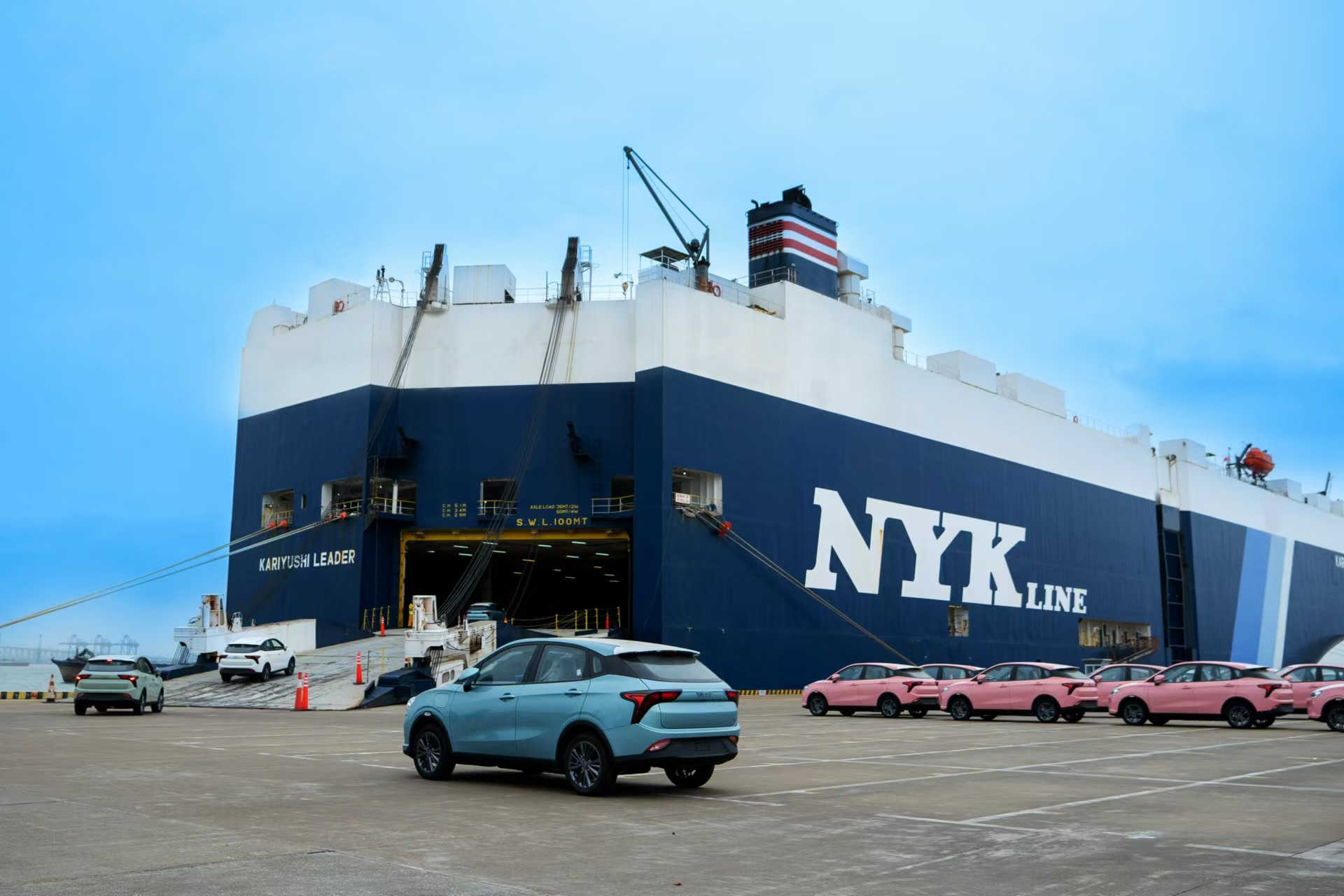 Vehicles of Chinese automaker Neta are about to be loaded onto a "ro-ro" (roll-on/roll-off) ship at the Yangshan Port in Shanghai for exportation to Thailand. (Photo courtesy of the interviewee)