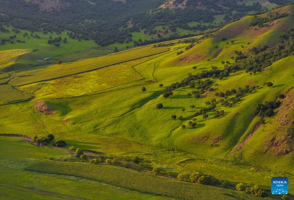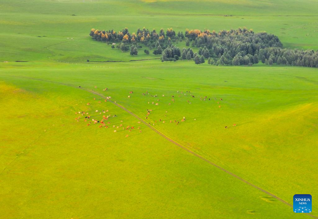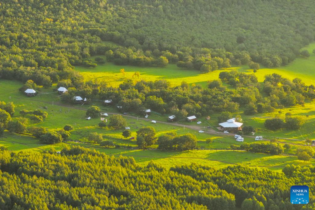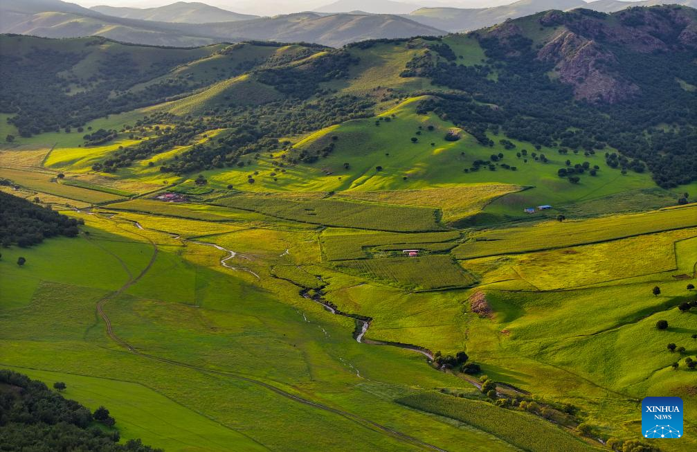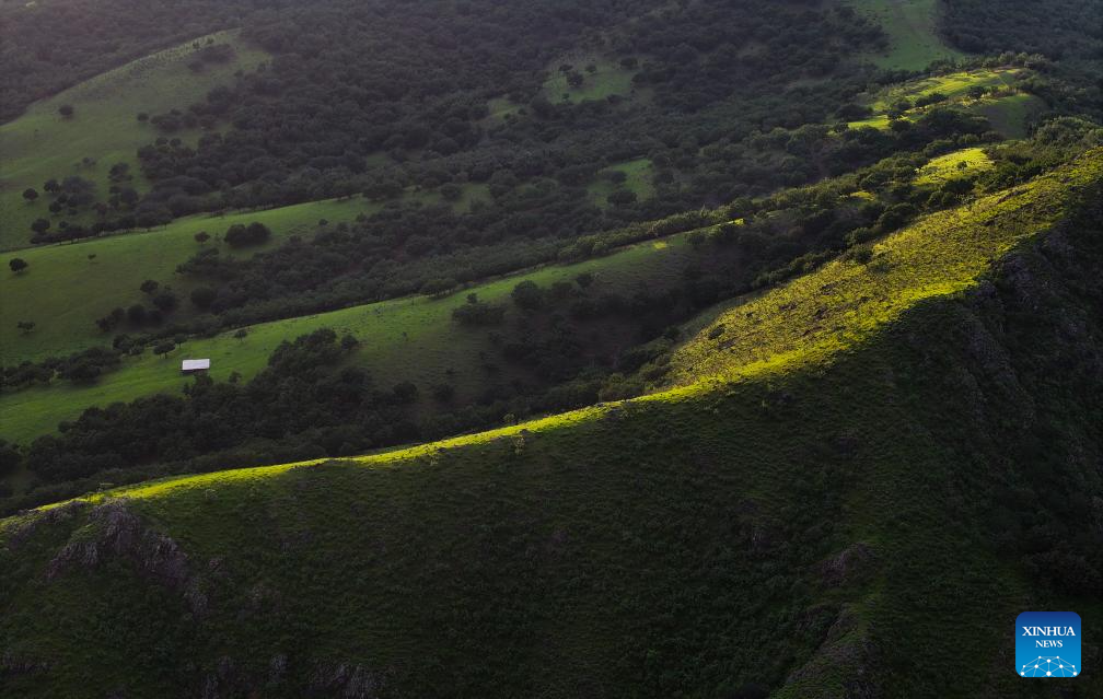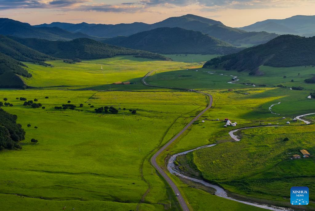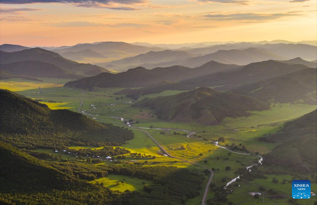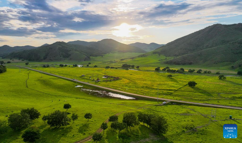 A drone photo taken on Aug. 8, 2024 shows the sunset scenery at the Wulanmaodu pasture in Horqin Right Wing Front Banner, Hinggan League, north China's Inner Mongolia Autonomous Region. (Xinhua/Lian Zhen)
