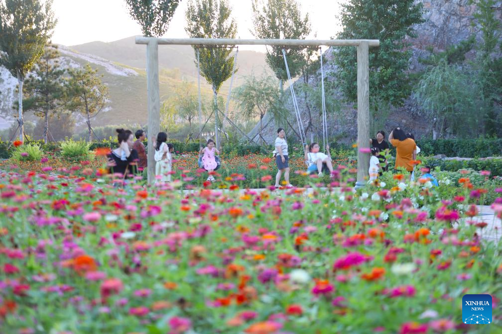 People visit the Beipiao mountain park in Beipiao City, northeast China's Liaoning Province, Aug. 8, 2024. Liaoning has strengthened restoration of ecological environment and accelerated the comprehensive treatment of mines in recent years. The quarry-transformed mountain park in Beipiao provides a summer resort for visitors. (Xinhua/Yang Qing)