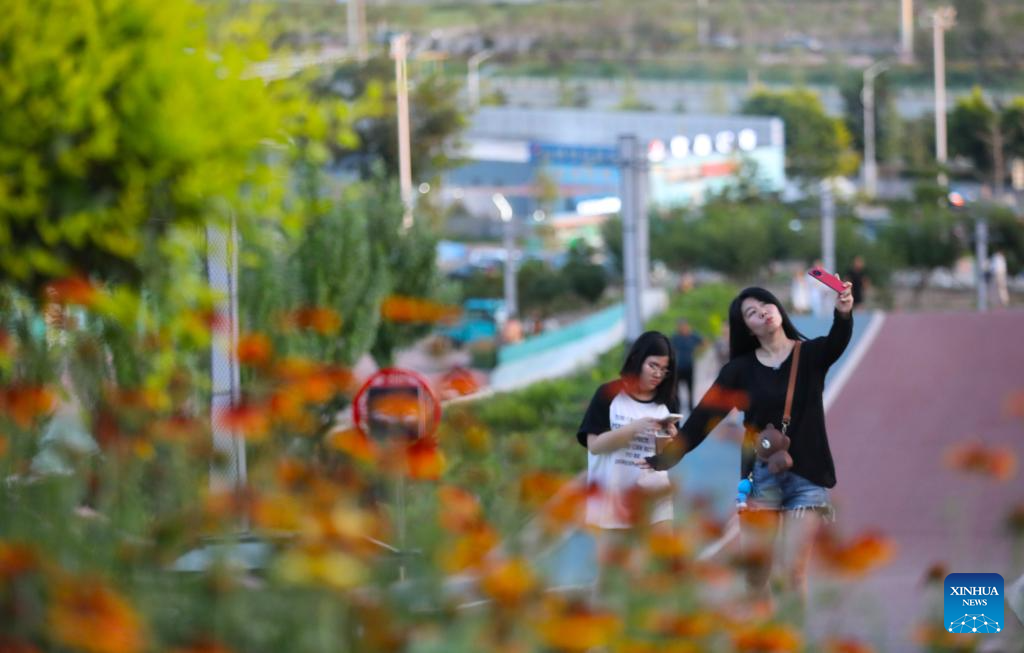 Citizens enjoy the view at the Beipiao mountain park in Beipiao City, northeast China's Liaoning Province, Aug. 8, 2024. Liaoning has strengthened restoration of ecological environment and accelerated the comprehensive treatment of mines in recent years. The quarry-transformed mountain park in Beipiao provides a summer resort for visitors. (Xinhua/Yang Qing)