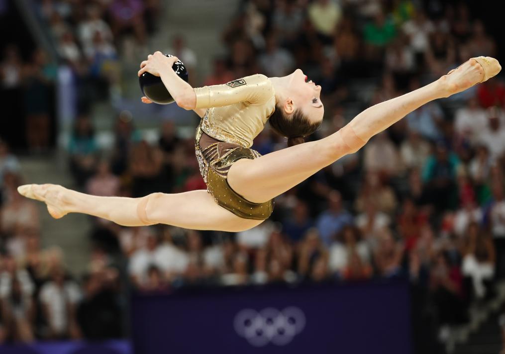 Darja Varfolomeev of Germany competes during the individual all-around final of rhythmic gymnastics at the Paris 2024 Olympic Games in Paris, France, Aug. 9, 2024. (Xinhua/Xu Yanan)