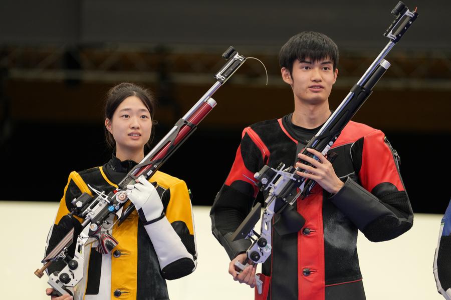 Huang Yuting (L)/Sheng Lihao of China celebrate after winning the 10m air rifle mixed team gold medal match against South Korea at the Paris 2024 Olympic Games in Chateauroux, France, on July 27, 2024. (Xinhua/Ju Huanzong)