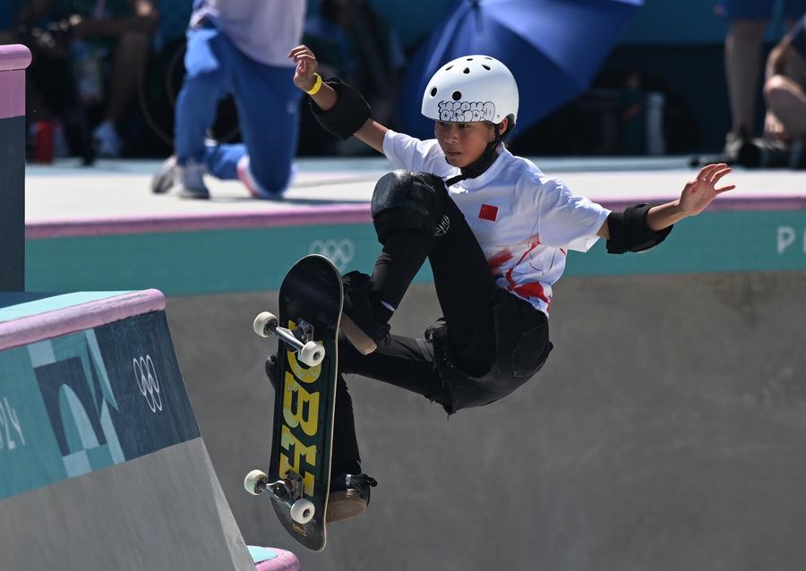 Zheng Haohao of China competes during the women's park prelims of skateboarding at the Paris 2024 Olympic Games in Paris, France, Aug. 6, 2024. (Xinhua/Cheng Min)