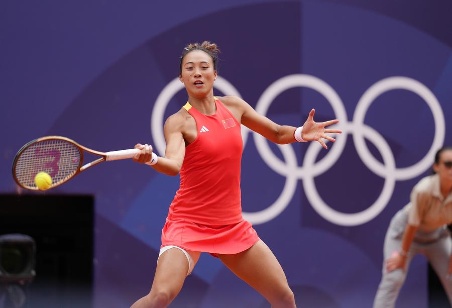 Zheng Qinwen of China competes during the women's singles gold medal match of tennis against Donna Vekic of Croatia at the Paris 2024 Olympic Games in Paris, France, on Aug. 3, 2024. (Xinhua/Wan Xiang)
