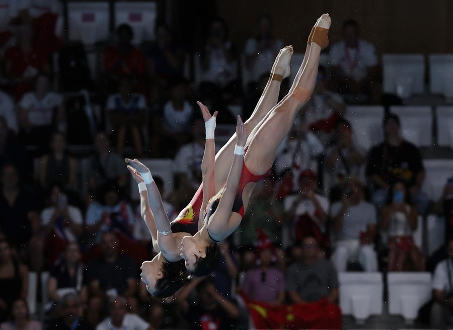 Chen Yuxi/Quan Hongchan (R) of China compete during the women's synchronized 10m platform final of diving at the Paris 2024 Olympic Games in Saint Denis, near Paris, France, on July 31, 2024. (Xinhua/Li Ying)