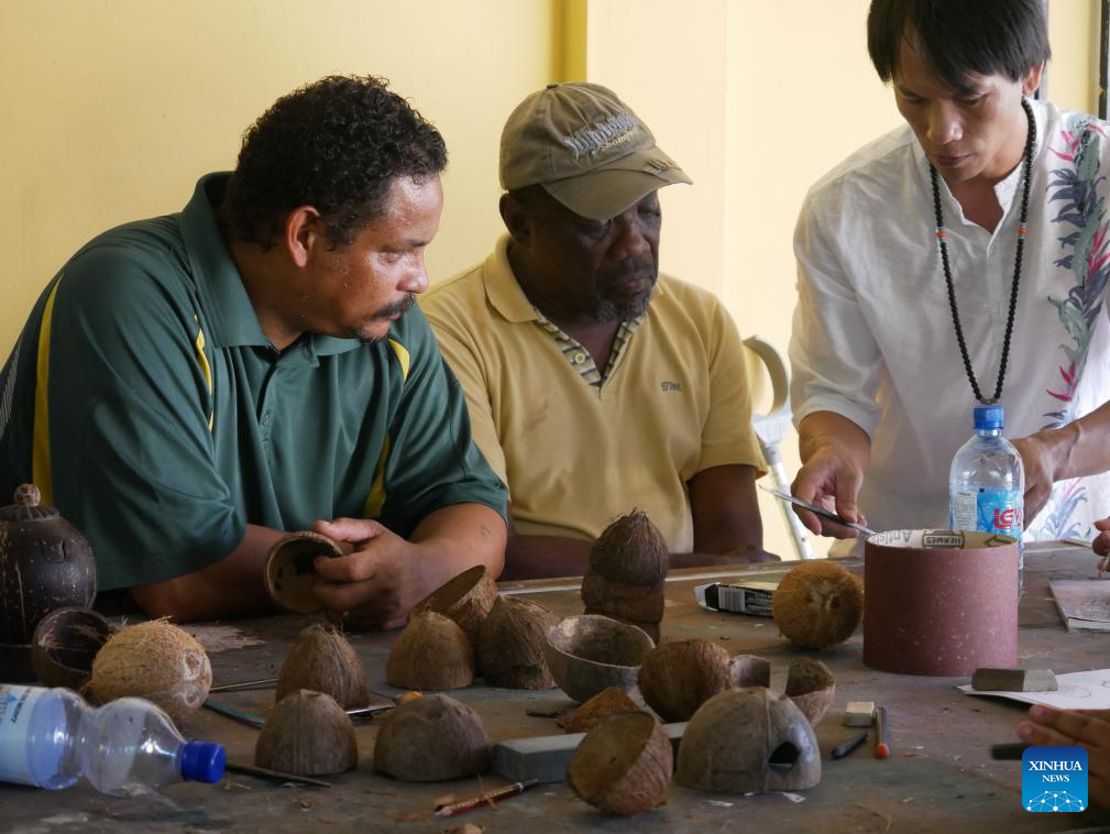 This undated file photo shows Wu Mingju (R) taking part in a cultural communication event for coconut shell carving in Seychelles. Coconut shell carving, an art form that involves the creation of designs using carving tools on the hard shell of a coconut, was listed as one of the national intangible cultural heritages in 2008. Wu Mingju, an inheritor of coconut shell carving, has been committed to the inheritance and promotion of this ancient and intricate art for 33 years by exploring technical innovation, setting up coconut shell carving courses in schools and cultivating young artists. Thanks to his efforts, the art has received a new lease on life. (Xinhua)