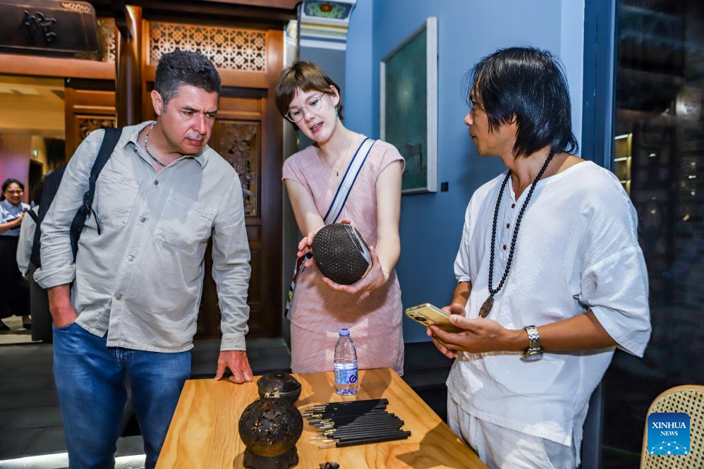 Wu Mingju (R) introduces coconut shell carving artworks to foreign customers at the Qilou old street in Haikou, south China's Hainan Province, April 22, 2024. Coconut shell carving, an art form that involves the creation of designs using carving tools on the hard shell of a coconut, was listed as one of the national intangible cultural heritages in 2008. Wu Mingju, an inheritor of coconut shell carving, has been committed to the inheritance and promotion of this ancient and intricate art for 33 years by exploring technical innovation, setting up coconut shell carving courses in schools and cultivating young artists. Thanks to his efforts, the art has received a new lease on life. (Xinhua)