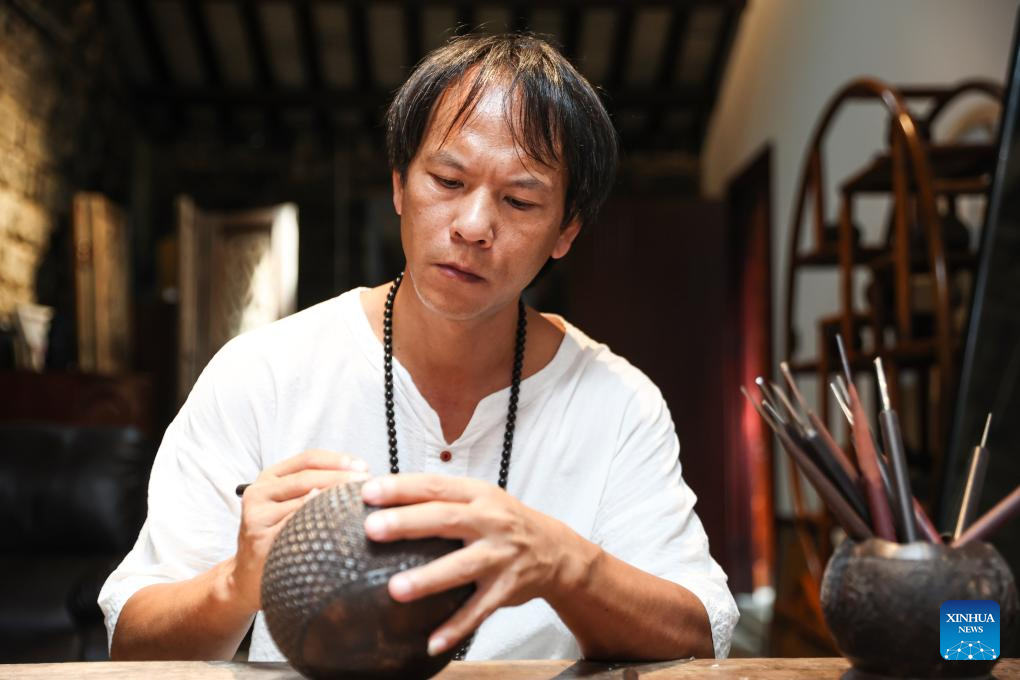 Wu Mingju carves on a coconut shell at a workshop in Haikou, south China's Hainan Province, Aug. 9, 2024. Coconut shell carving, an art form that involves the creation of designs using carving tools on the hard shell of a coconut, was listed as one of the national intangible cultural heritages in 2008. Wu Mingju, an inheritor of coconut shell carving, has been committed to the inheritance and promotion of this ancient and intricate art for 33 years by exploring technical innovation, setting up coconut shell carving courses in schools and cultivating young artists. Thanks to his efforts, the art has received a new lease on life. (Xinhua/Zhang Liyun)