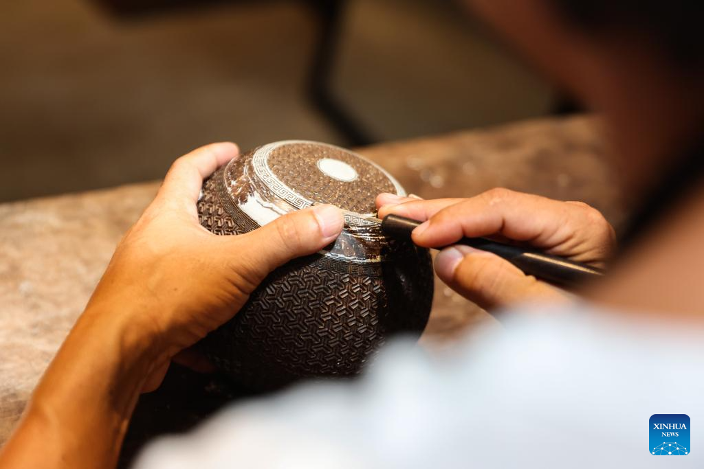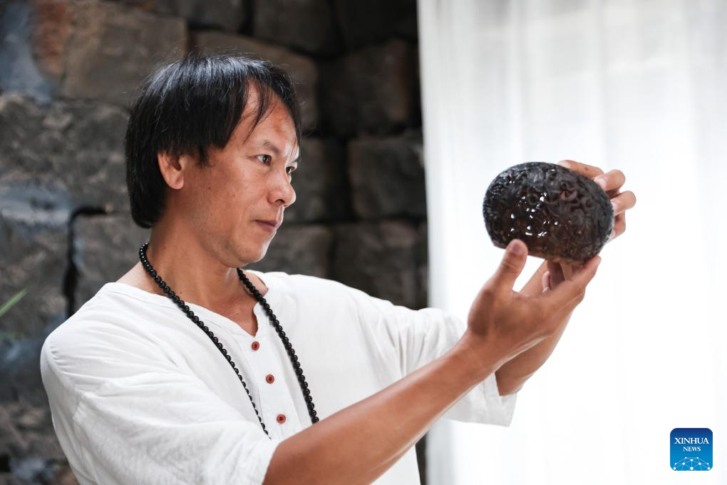 Wu Mingju checks his coconut shell carving artwork at a workshop in Haikou, south China's Hainan Province, Aug. 9, 2024. Coconut shell carving, an art form that involves the creation of designs using carving tools on the hard shell of a coconut, was listed as one of the national intangible cultural heritages in 2008. Wu Mingju, an inheritor of coconut shell carving, has been committed to the inheritance and promotion of this ancient and intricate art for 33 years by exploring technical innovation, setting up coconut shell carving courses in schools and cultivating young artists. Thanks to his efforts, the art has received a new lease on life. (Xinhua/Zhang Liyun)
