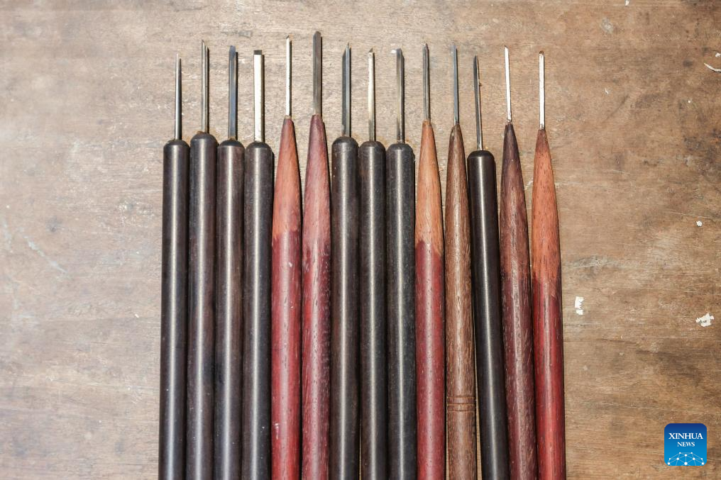 Tools for coconut shell carving used by Wu Mingju are pictured on Aug. 9, 2024. Coconut shell carving, an art form that involves the creation of designs using carving tools on the hard shell of a coconut, was listed as one of the national intangible cultural heritages in 2008. Wu Mingju, an inheritor of coconut shell carving, has been committed to the inheritance and promotion of this ancient and intricate art for 33 years by exploring technical innovation, setting up coconut shell carving courses in schools and cultivating young artists. Thanks to his efforts, the art has received a new lease on life. (Xinhua/Zhang Liyun)