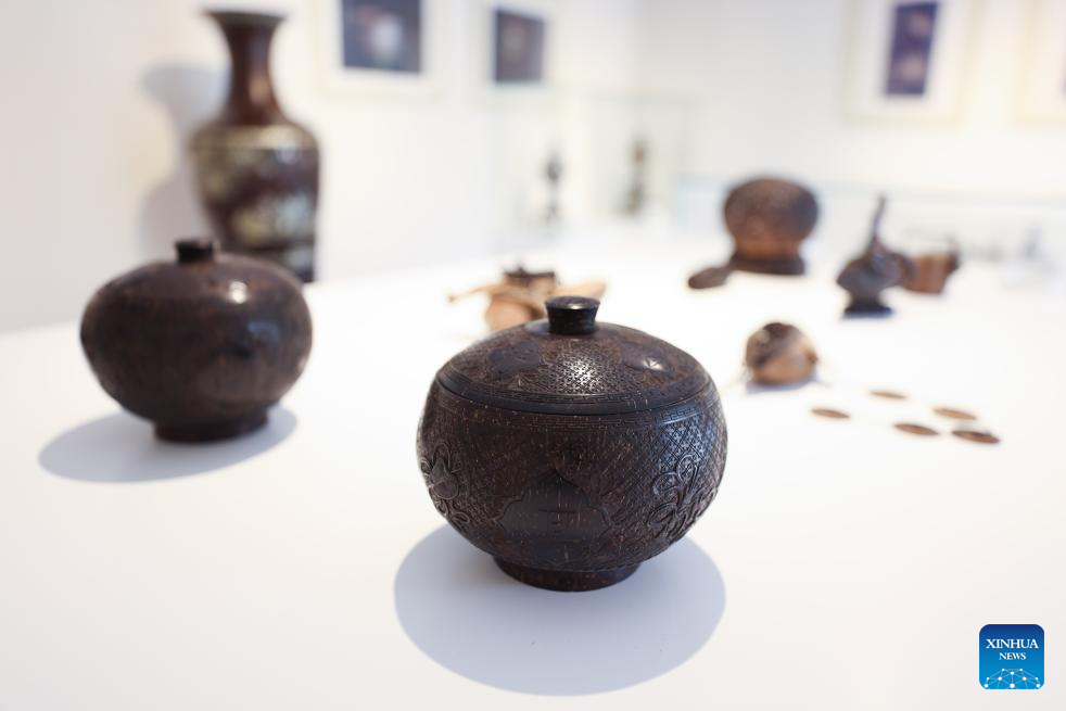 Coconut shell carving artworks made by Wu Mingju are displayed at an exhibition featuring the city of Haikou during the Boao Forum for Asia Annual Conference 2024 held in Boao, south China's Hainan Province, March 26, 2024. Coconut shell carving, an art form that involves the creation of designs using carving tools on the hard shell of a coconut, was listed as one of the national intangible cultural heritages in 2008. Wu Mingju, an inheritor of coconut shell carving, has been committed to the inheritance and promotion of this ancient and intricate art for 33 years by exploring technical innovation, setting up coconut shell carving courses in schools and cultivating young artists. Thanks to his efforts, the art has received a new lease on life. (Xinhua/Zhang Liyun)