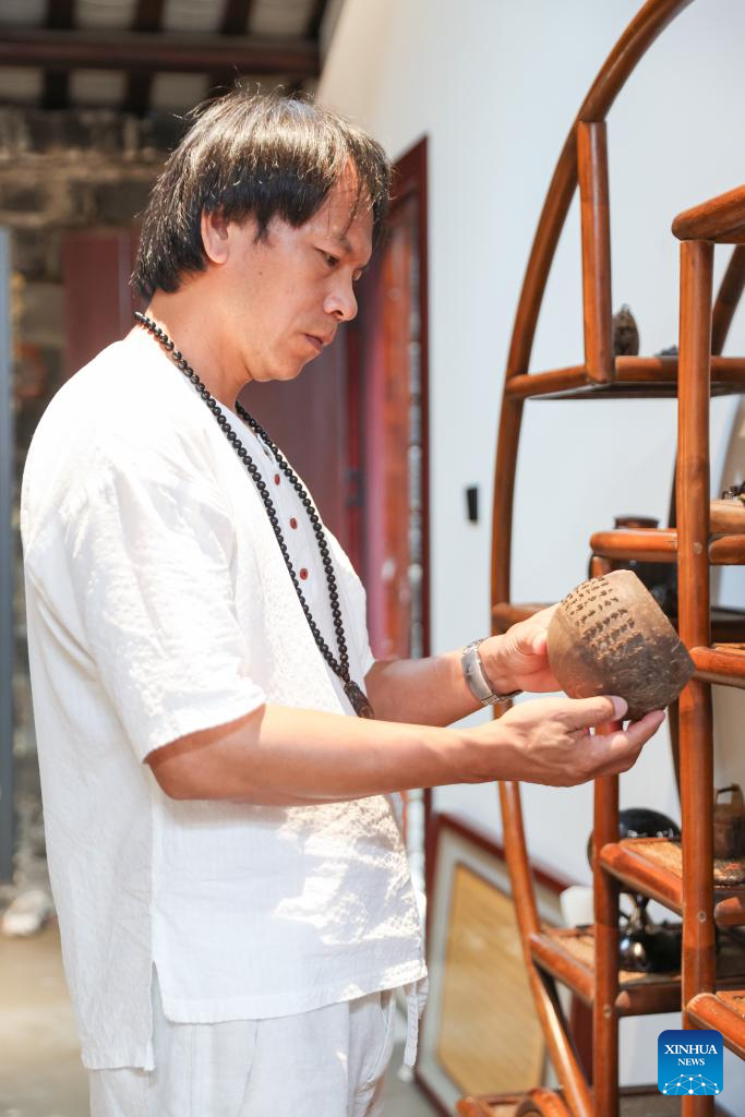 Wu Mingju arranges coconut shell carving artworks at a workshop in Haikou, south China's Hainan Province, Aug. 9, 2024. Coconut shell carving, an art form that involves the creation of designs using carving tools on the hard shell of a coconut, was listed as one of the national intangible cultural heritages in 2008. Wu Mingju, an inheritor of coconut shell carving, has been committed to the inheritance and promotion of this ancient and intricate art for 33 years by exploring technical innovation, setting up coconut shell carving courses in schools and cultivating young artists. Thanks to his efforts, the art has received a new lease on life. (Xinhua/Zhang Liyun)
