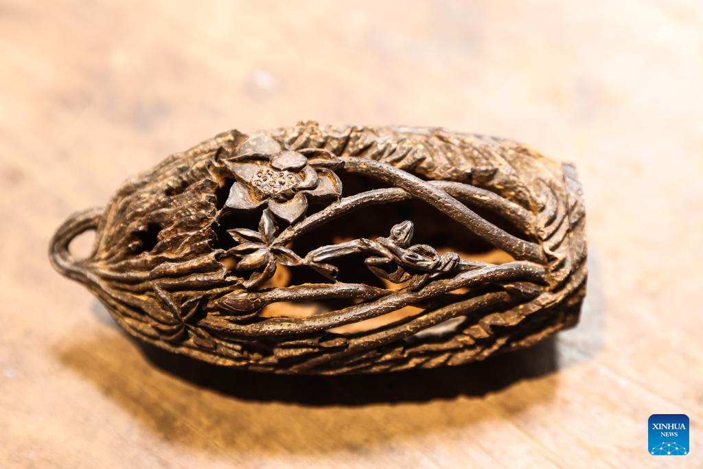 A coconut shell carving artwork made by Wu Mingju is pictured on Aug. 9, 2024. Coconut shell carving, an art form that involves the creation of designs using carving tools on the hard shell of a coconut, was listed as one of the national intangible cultural heritages in 2008. Wu Mingju, an inheritor of coconut shell carving, has been committed to the inheritance and promotion of this ancient and intricate art for 33 years by exploring technical innovation, setting up coconut shell carving courses in schools and cultivating young artists. Thanks to his efforts, the art has received a new lease on life. (Xinhua/Zhang Liyun)