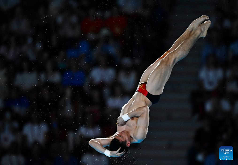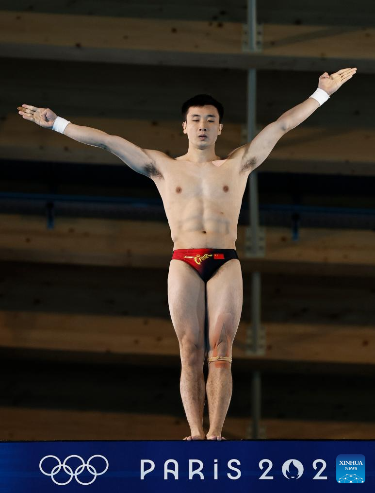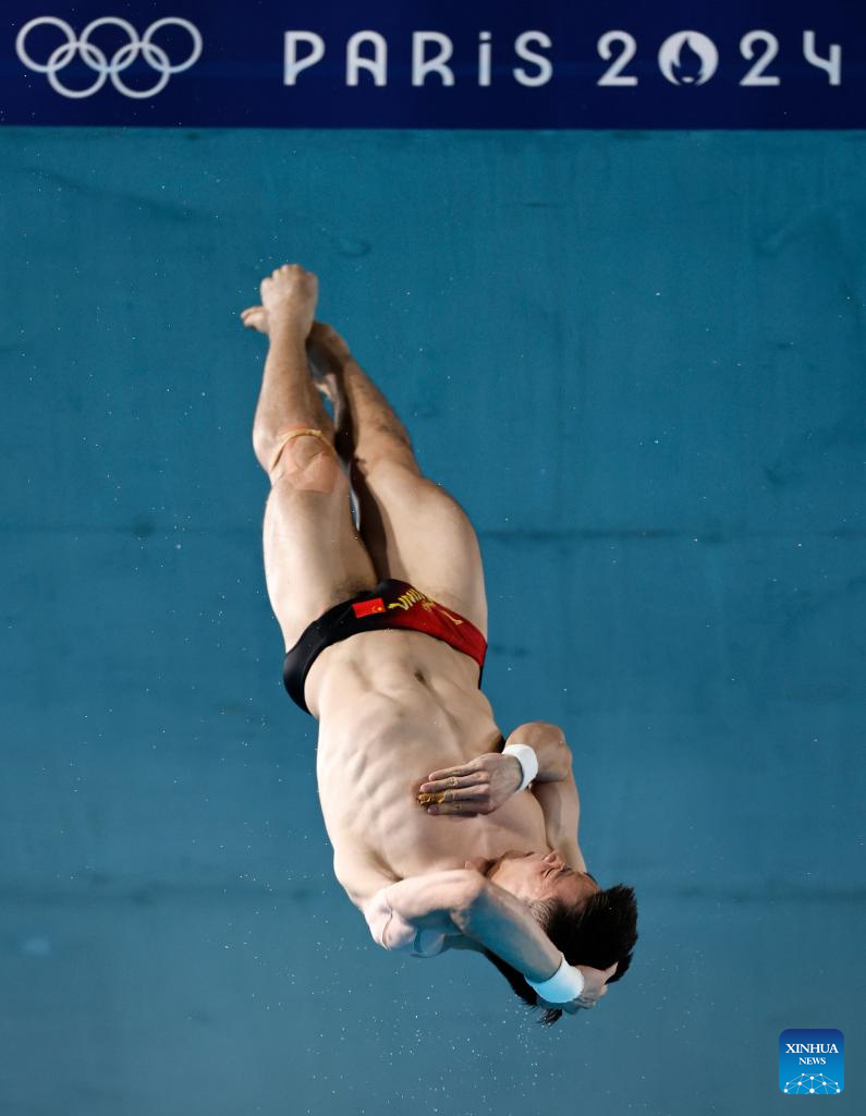 Cao Yuan of China competes during the men's 10m platform final of diving at the Paris 2024 Olympic Games in Saint-Denis, France, Aug. 10, 2024. (Xinhua/Zhang Yuwei)