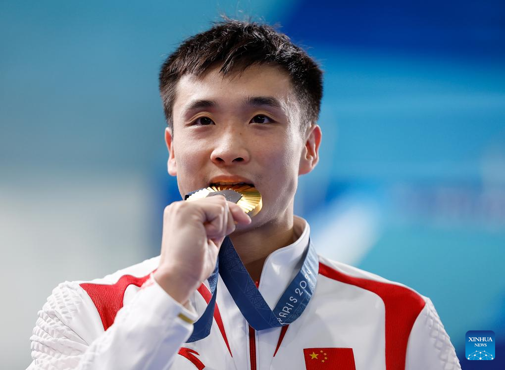 Gold medalist Cao Yuan of China attends the awarding ceremony after the men's 10m platform final of diving at the Paris 2024 Olympic Games in Saint-Denis, France, Aug. 10, 2024. (Xinhua/Zhang Yuwei)