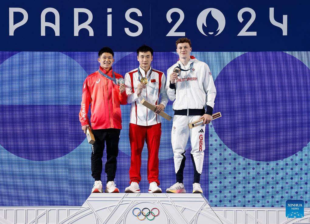 Gold medalist Cao Yuan (C) of China, silver medalist Tamai Rikuto (L) of Japan and bronze medalist Noah Williams of Great Britain attend the awarding ceremony after the men's 10m platform final of diving at the Paris 2024 Olympic Games in Saint-Denis, France, Aug. 10, 2024. (Xinhua/Zhang Yuwei)
